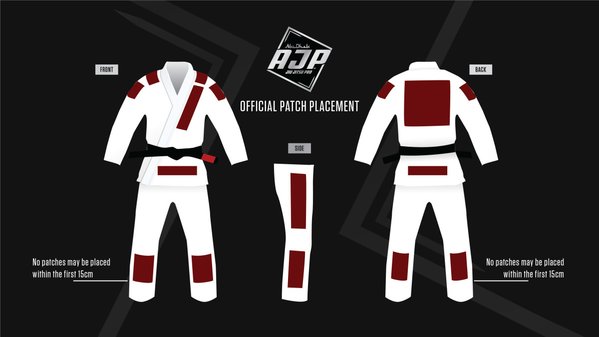 - Permitido: a marca do kimono na parte frontal de baixo do kimono (de acordo com a ilustração). A etiqueta deve ser feita de tecido fino (não bordado) e ter no máximo 36cm².